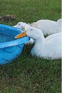On June 25th the Gonsalves family said goodbye to Louie. Ever since she was a duckling, she was the sweetest of the bunch and only wanted to sit on your lap and cuddle. As she got older, that didn't change. She loved being in the water, whether it was her kiddie pool outside, or coming inside the house for a special swim in the tub and hanging out with her humans. Although nothing could compare to the bond she had with her mate, Peach. He would follow her no matter where she went and they would cuddle together after a long day of being ducks. Her favorite snacks were definitely peas and cherry tomatoes but she also enjoyed slurping worms up from the yard like noodles and the occasional frog she would find in the pool. We will certainly miss our Louie hugs and snuggles, but she's with her sister George at peace now. We'll take good care of Peach for you until you're reunited again. We will love you always Louie!