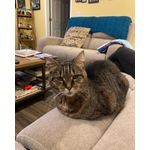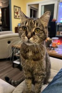 On February 14, 2012 we heard a small squeak on our back sliding door. When we looked out the door there was a small, underfed, and very cold striped cat pawing at our door. It was a very cold day. We brought her in and gave her some food. We brought her to the vet, she had no chip. The vet checked her out, said that she was between 1 and 3 years old and had no claws on her front or back paws. She joined our family and we named her Minnie… “she chose us”. A very quiet but loving cat; she never saw a box she wouldn’t sit in, was the only one of our 3 cats that was not afraid of our dog Dola. She loved her water, her “cat treats”, and playing with Tigger and Ruby. She sat with us every night until she went to sleep in “her basket”. On Sunday she left us and though we are sad, we are glad she chose us to spend the last 10 years of her life. We miss you Minnie.